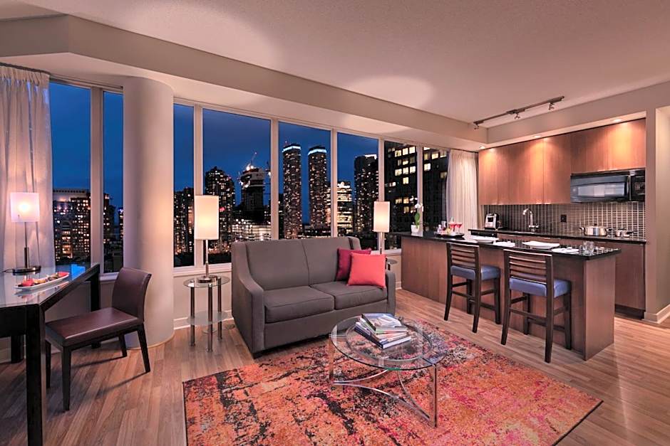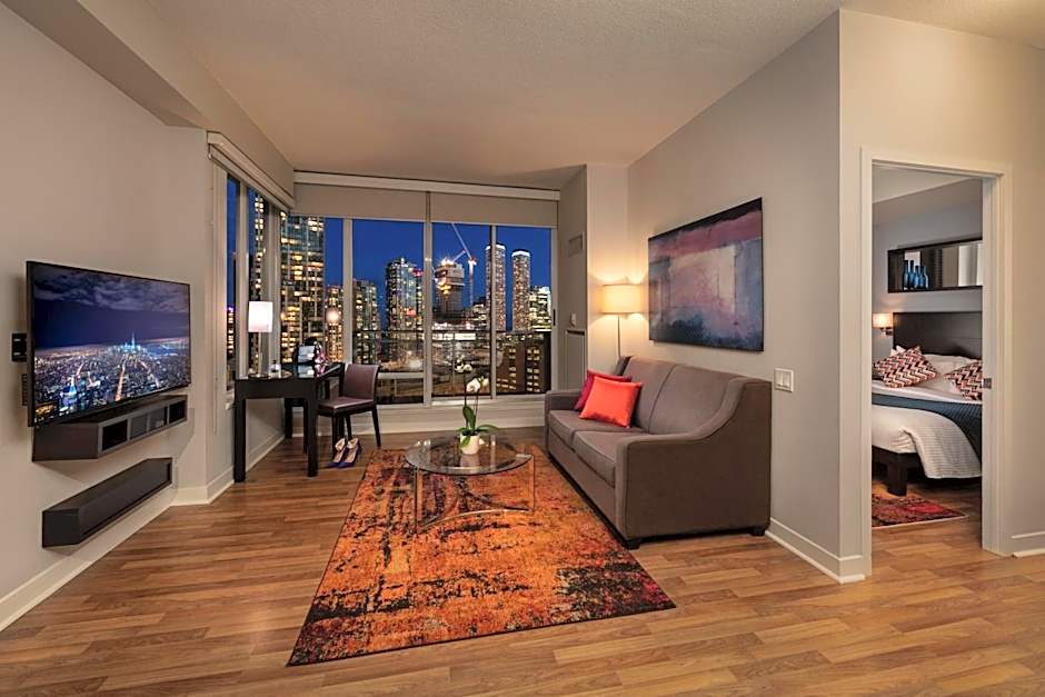 Providing city views from the floor-to-ceiling windows, this suite has a separate bedroom and living room area each with its own television - 55" LED TV, and kitchen equipped with a stove, microwave and mini fridge.
